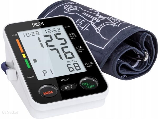 CIŚNIENIOMIERZ NARAMIENNY AUTOMATYCZNY BPM100 TSA8045Ciśnieniomierz naramienny Teesa BPM100 to urządzenie, które powinno obowiązkowo znaleźć się w Twoim domu. Aparat, dzięki prostej obsłudze i wykorzystaniu oscylometrycznej metody pomiaru zmian ciśnienia w mankiecie, umożliwia szybką i samodzielną kontrolę ciśnienia krwi. Co ważne, urządzenie, dzięki swojej funkcjonalności, poinformuje Cię o wszelkich nieprawidłowościach związanych z arytmią serca.Teesa BPM100, dzięki swojej dokładności pozwoli Ci poczuć się pewniej, bądź też odpowiednio wcześniej podjąć działania profilaktyczne! Wykonany aparatem pomiar Twojego ciśnienia jest zgodny z normą określoną przez WHO. Dla jeszcze lepszej kontroli wyników urządzenie wyposażone zostało w funkcję zapamiętywania 90 ostatnich pomiarów wykonanych przez dwóch użytkowników.Wszelkie potrzebne informacje, tj. pomiar ciśnienia i tętna, a także data i godzina są w czytelny sposób zaprezentowane na wyświetlaczu LCD. Dodatkowe podświetlenie sprawia, że możesz dokonywać kontroli pomiaru także przy słabym oświetleniu.Opis i specyfikacjaPomiar oscylometryczny TakPomiar jednym przyciskiem TakWskaźnik ciśnienia krwi według WHO TakDuży podświetlany cyfrowy wyświetlacz LCD TakWykrywanie arytmii serca TakZakres pomiaru ciśnienia 30 – 280 mmHgZakres pomiaru tętna 40 – 199 uderzeń/minutęDokładność pomiaru ciśnienia +/- 3 mmHgDokładność pomiaru tętna +/- 5%Obwód mankietu 22 – 32 cmFunkcja daty i godziny TakPamięć 2x 90 pomiarów wraz z datą i godziną dla dwóch użytkowników TakFunkcja automatycznego wyłączenia po 1 minucie TakWskaźnik niskiego poziomu baterii TakKlasyfikacja Typ BFStopień ochrony IP20Temperatura pracy 5°C – 40°CWilgotność pracy 15 – 93%Temperatura przechowywania -20°C – 55°CWilgotność przechowywania 0 – 93%Zasilanie 4x bateria AA 1,5 V (ok. 200 pomiarów)W zestawie mankiet, pokrowiec, instrukcja obsługiWymiary 95,9 x 78 x 150 mmWaga 445 g (bez baterii)