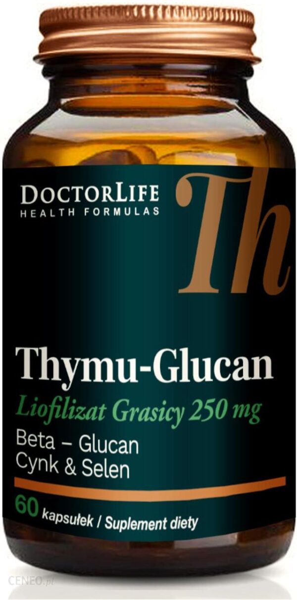 Suplement diety Thymu-Glukan zawiera m.in. cynk, selen, beta glukan. Preparat zaleca się wszystkim osobom, które chcą uzupełnić codzienną dietę w powyższe substancje.Składniki:Liofilizat grasicy cielęcej, Beta-Glucan z drożdży piekarniczych Saccharomyces cerevisiae , Cynk (glukonian cynku), Selen (L-selenometionina), otoczka kapsułki (hydroksypropylometyloceluloza). 1 kapsułka zawiera: Hydrolizat grasicy 250mg, Beta-Glucan (Doctor-Gard®) 120mg, cynk 5mg (50%*), Selen 60mcg (109%*). * RWS – Referencyjna Wartość SpożyciaMasa netto:35 gramów.Właściwości:Thymu-Glukan jest suplementem diety w kapsułkach dojelitowych, zawierającym synergistyczną kompozycję peptydów grasicy cielęcej (tymomoduliny) w połączeniu z beta-glukanami, cynku oraz selenu. Thymu-Glucan jest unikalnym preparatem, który został opracowany dzięki merytorycznemu wsparciu Profesora Immunologii Klinicznej, Chorób Wewnętrznych i Zdrowia Publicznego. Nowa formuła jest rezultatem jego doświadczeń ze stosowania suplementu Thym-Uvocal Plus oraz beta-glukanów w terapii pacjentów z niedoborami odporności, infekcjami wirusowymi jak EBV, czy chorych na przewlekłą białaczkę limfocytową (CLL).Działanie preparatu polega na wspomaganiu procesów fizjologicznych, zachodzących w organizmie dla utrzymania homeostazy zarówno w obrębie grasicy (Thymus) jak i całego układu immunologicznego.Formuła pomaga odmłodzić funkcje grasicy przez co zregenerować osłabiony układ odpornościowy oraz korzystnie wpływa na ogólny stan zdrowia, dzięki czemu organizm może efektywniej walczyć z infekcją i zmniejsza podatność na choroby. Grasica jest jego kluczowym elementem, który odpowiada za dojrzewanie limfocytów T. Właśnie limfocyty T są skuteczną bronią organizmu w walce z intruzami jak bakterie, wirusy.Zalecane dzienne spożycie:Jeżeli lekarz nie zaleci inaczej, stosować 1 kapsułkę rano i 1 wieczorem, najlepiej około 30 minut przed lub ok. 2 godziny po posiłku, w cyklach przez 5 kolejnych dni, po których następują 2 dni przerwy.Dzieci wieku powyżej 12 lat: 1 kapsułka podczas posiłku popijając wodą. W przypadku problemów z połykaniem kapsułkę można otworzyć a jej zawartość rozpuścić np. w jogurcie.Przeciwwskazania:Nadwrażliwość na którykolwiek ze składników preparatu. Skonsultuj się z lekarzem w przpadku gdy jesteś w ciąży, karmisz piersią lub przyjmujesz leki.Przechowywanie:Przechowywać w temp. pokojowej (do 25C) w suchym miejscu sposób niedostępny dla małych dzieci. Ważne informacje:Nie należy przekraczać zalecanej porcji do spożycia w ciągu dnia. Suplement diety nie może być stosowany jako substytut (zamiennik) zróżnicowanej diety ani aktywnego trybu życia. Utrzymanie prawidłowego stanu zdrowia wymaga zrównoważonego i zróżnicowanego odżywiania i prowadzenia zdrowego trybu życia. Istnieje wiele czynników ryzyka choroby. Zmiana jednego z tych czynników ryzyka może wywierać korzystny wpływ lub nie wywierać go.Producent:DoctorLife LtdSackville St, Mayfair, London W1S 3AX
