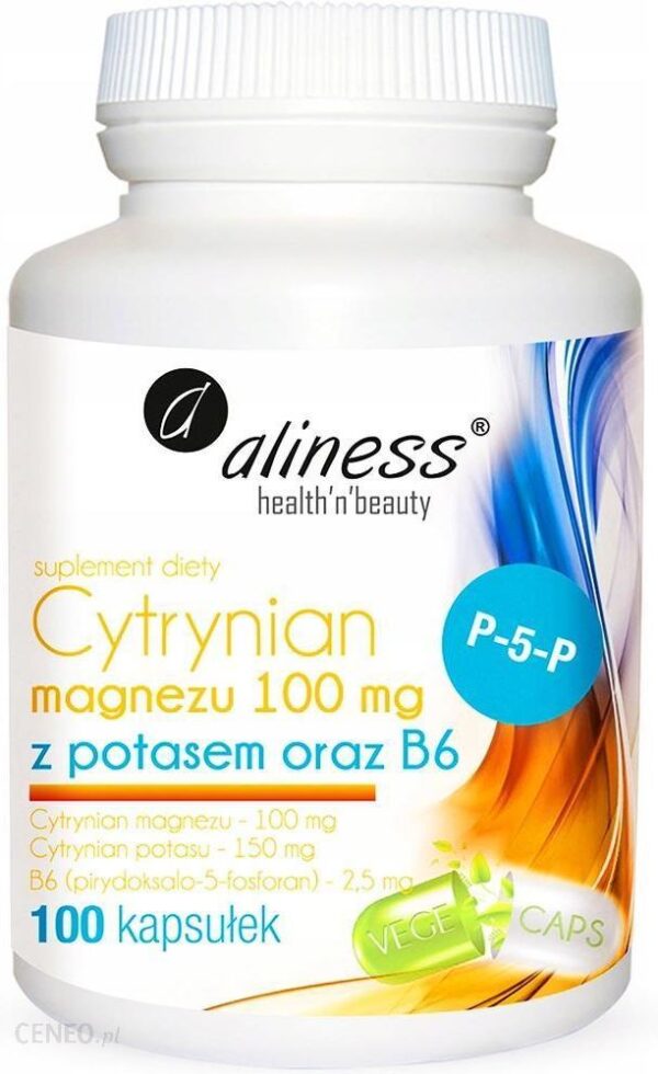 Aliness Cytrynian MagnezuMagnez:-pomaga w utrzymaniu równowagi elektrolitowej-pomaga w utrzymaniu zdrowych zębów-pomaga w utrzymaniu zdrowych kości-przyczynia się do utrzymania prawidłowego metabolizmu energetycznego-pomaga w prawidłowym funkcjonowaniu mięśni-pomaga w prawidłowym funkcjonowaniu układu nerwowego-przyczynia się do zmniejszenia uczucia zmęczenia i znużenia-pomaga w utrzymaniu prawidłowych funkcji psychologicznych-pomaga w prawidłowej syntezie białka-odgrywa rolę w procesie podziału komórek-przyczynia się do prawidłowego rozwoju kości u dzieciWitamina B6 (w postaci P5P czyli aktywnej formie pirydoksalo-5-fosforan):-pomaga w utrzymaniu prawidłowego metabolizmu homocysteiny-pomaga w prawidłowej syntezie cysteiny-przyczynia się do utrzymania prawidłowego metabolizmu białka i glikogenu-pomaga w prawidłowym funkcjonowaniu układu nerwowego-pomaga w prawidłowej produkcji czerwonych krwinek-pomaga w prawidłowym funkcjonowaniu układu odpornościowego-przyczynia się do regulacji aktywności hormonalnej-przyczynia się do utrzymania prawidłowego metabolizmu energetycznego-pomaga w utrzymaniu prawidłowych funkcji psychologicznychSkładniki: Magnez (cytrynian magnezu), witamina B6 (pirydoksalo-5-fosforan ), substancja glazurująca: hydroksypropylometyloceluloza.Składniki w 1 kapsułce: Cytrynian magnezu 650mg w tym magnez 100mg (*26,6%) Cytrynian potasu 425mg w tym potas 150mg (*7,5%) Witamina B6 (pirydoksalo-5-fosforan) 2,5mg (*178,5%) *RWS – dzienna referencyjna wartość spożycia dla osób dorosłych Składniki w 2 kapsułkach: Cytrynian magnezu 1300mg w tym magnez 200mg (*53,3%) Cytrynian potasu 850mg w tym potas 300mg (*15%) Witamina B6 (pirydoksalo-5-fosforan) 5mg (*357%) *RWS – dzienna referencyjna wartość spożycia dla osób dorosłych